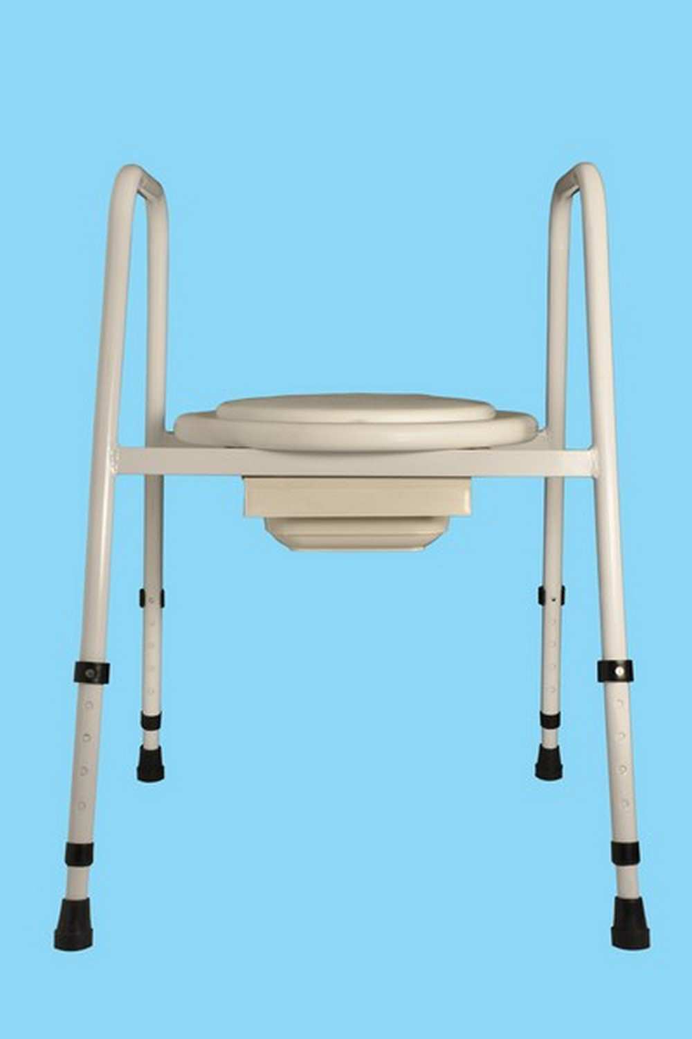 Estructura de acero, con apoyabrazos, asiento y tapa rebatibles y desmontables. Regulable en altura. Incluye bacinilla plástica con tapa y manija.